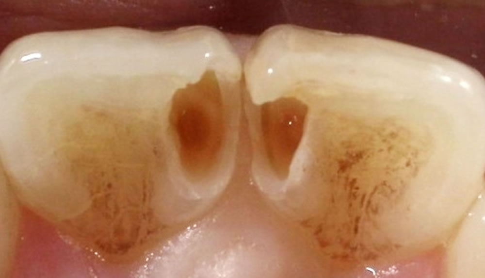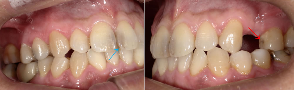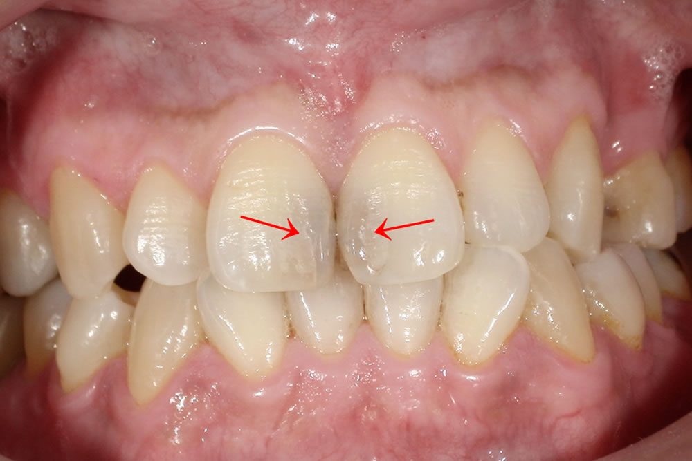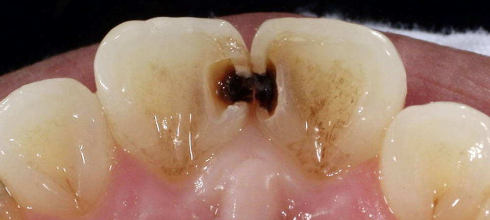 →で示すように前歯2本はともに、 歯の1/3ほどを占めるような大きな虫歯になっています。治療法としては黒い虫歯を完全に除去してコンポジットレジン(CR)を詰めていきます。