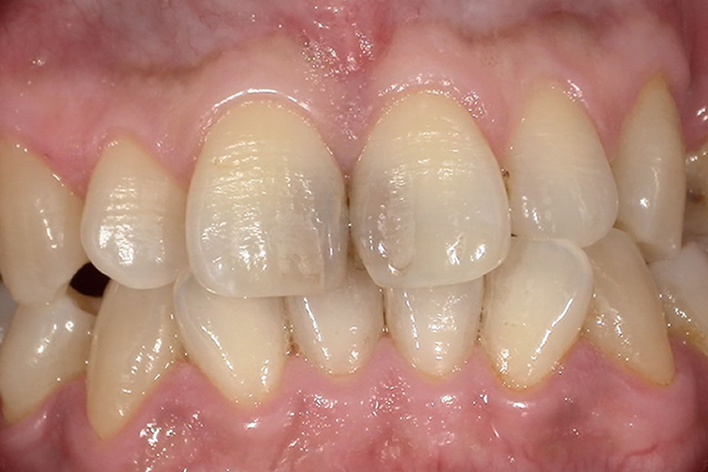 虫歯を完全に除去し、唇側の面の歯質を一層、意図的に残すことで最小限の切削にとどめるだけでなく、将来的にCRによる変色を防ぐことを目標に治療しました。