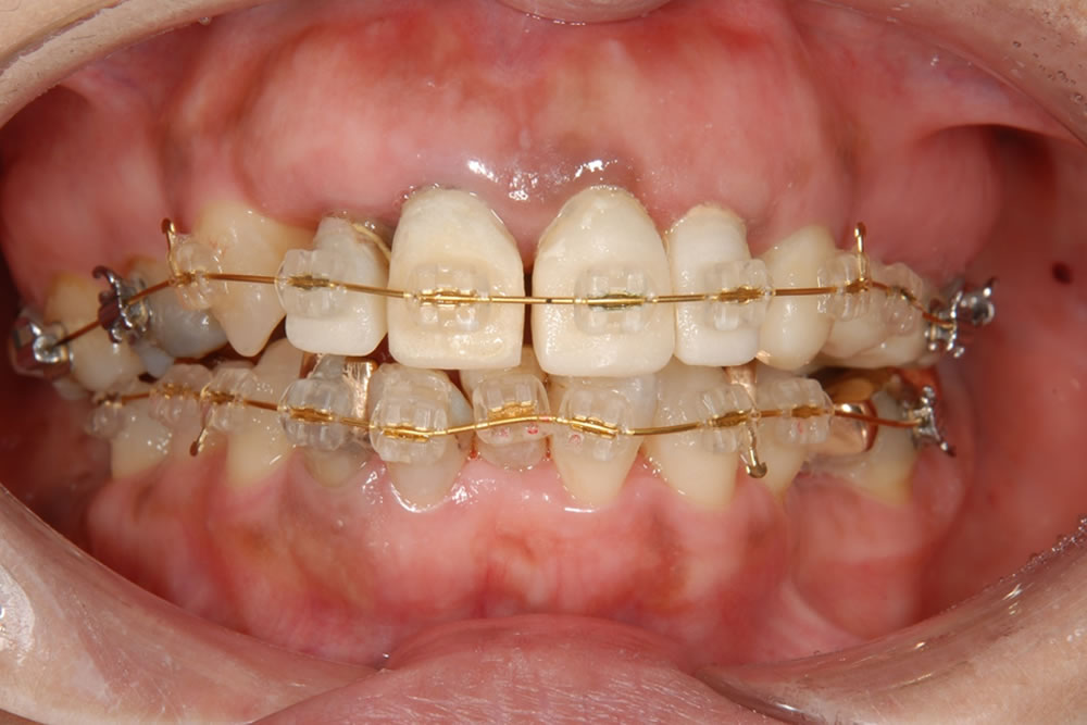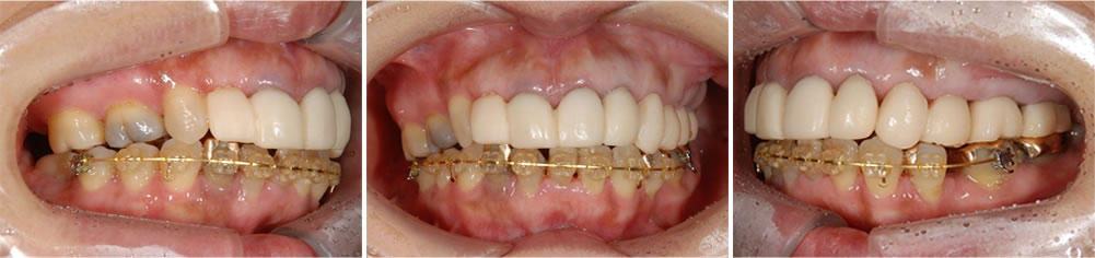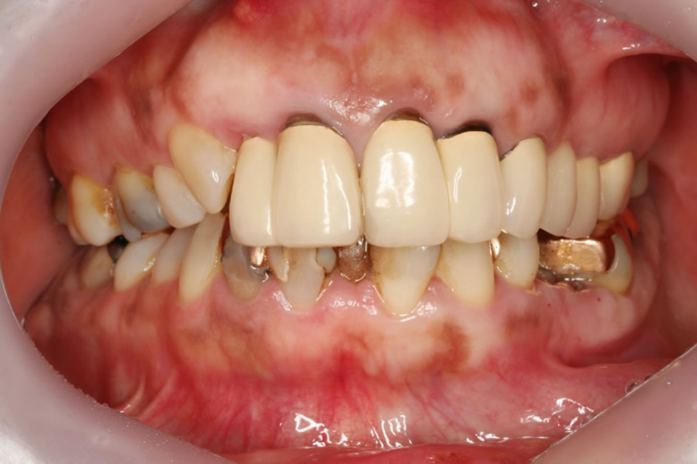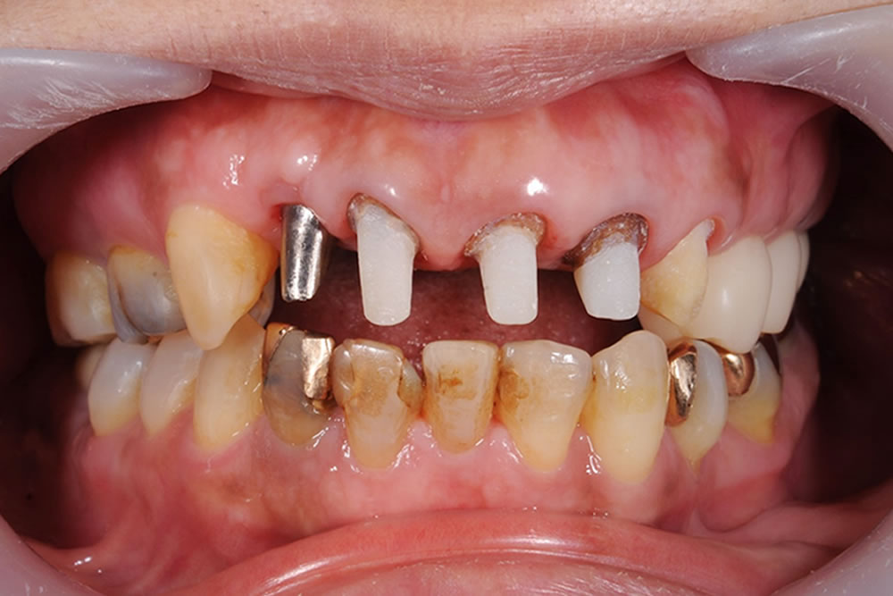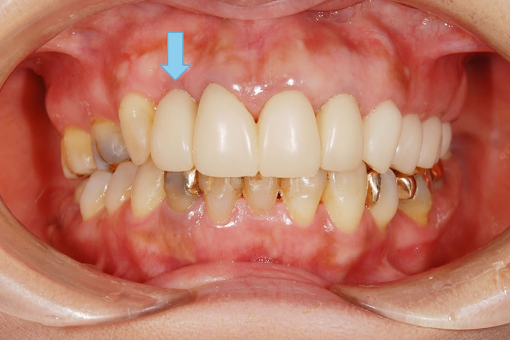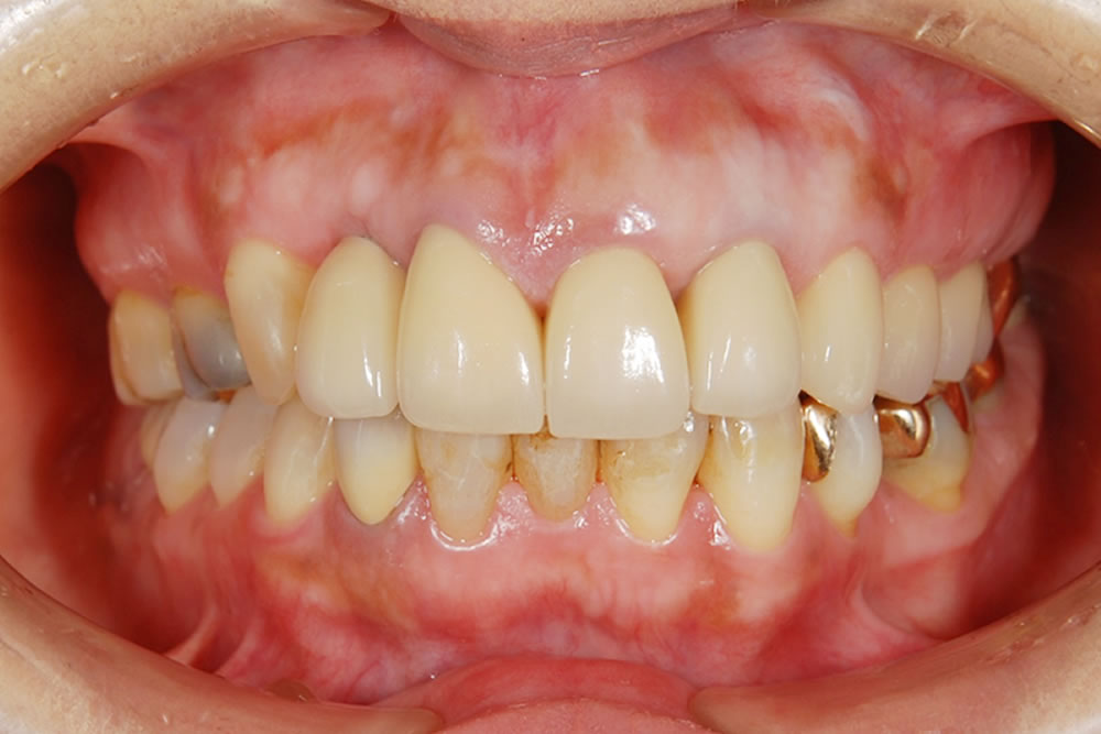 上の前歯のサイズが不規則になっており、歯とセラミックの境目も露出して黒ずんで見えていました。全体的に軽度から中等度の歯周病もありました。
