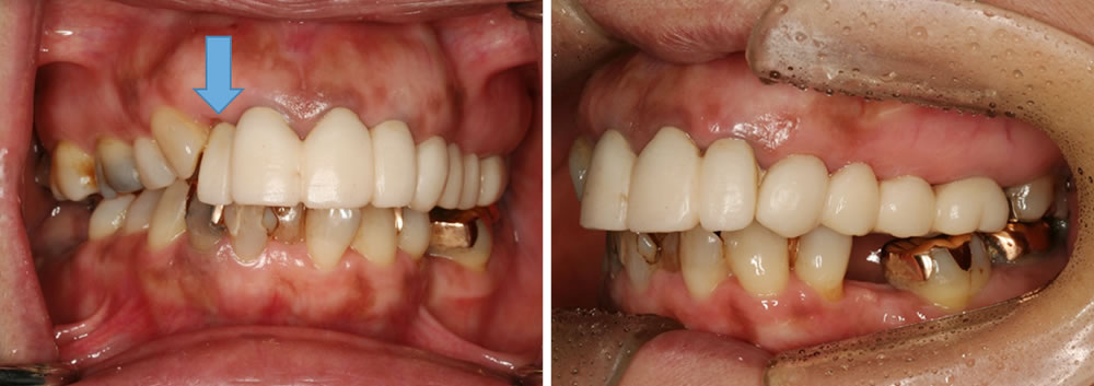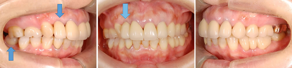 見た目、かみ合わせ、歯周病いずれもきれいに治っています。インプラントは上の前歯と下の奥歯にそれぞれ1本ずつ入っています。(青矢印)