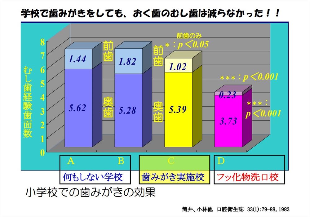 前歯は虫歯が減ったが奥歯の虫歯は減らなかった、というデータが示されています。